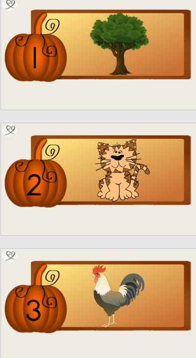 De plaatjes zonder cijfers doe ik in een bak of zak. In het geval van de herfst verstop ik ze ook wel eens op de herfst tafel.