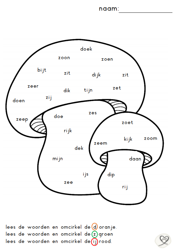 Bij dit werkblad oefenen we met het lezen van woorden met de d, ij en z. Vervolgens gaan de kinderen op zoek naar de letters d, z en ij in de woorden en omcirkelen deze in de juiste kleur.