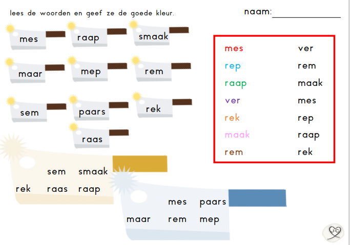 Laat de kinderen rollen met een dobbelsteen en een woordje kiezen uit de kolom. Dit woordje lezen zij en mogen zij daarna inkleuren. Wanneer ze een hele rij (of de hele kaart) vol hebben, hebben ze bingo. Ik deel dan vaak een sticker uit. De kinderen zijn zo spelenderwijs bezig met lezen.
