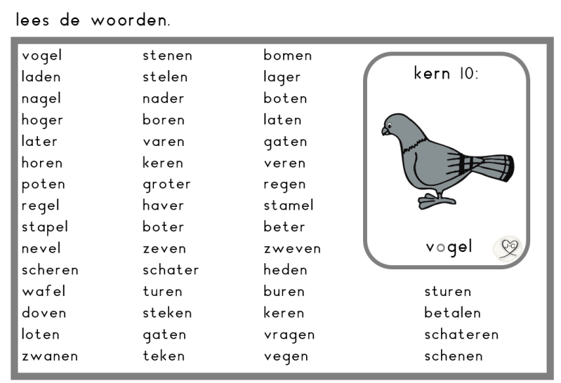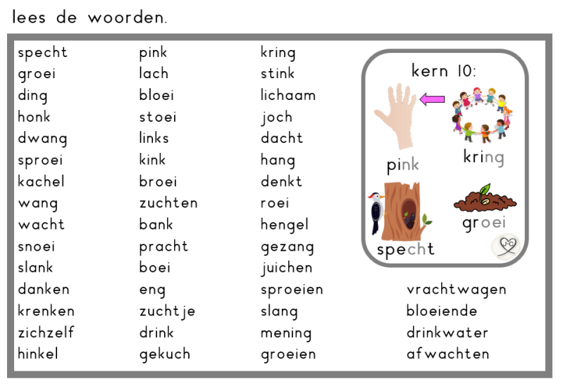 Laat de kinderen rollen met een dobbelsteen en een woordje kiezen uit de kolom. Dit woordje lezen zij en mogen zij daarna inkleuren. Wanneer ze een hele rij (of de hele kaart) vol hebben, hebben ze bingo. Ik deel dan vaak een sticker uit. De kinderen zijn zo spelenderwijs bezig met lezen.