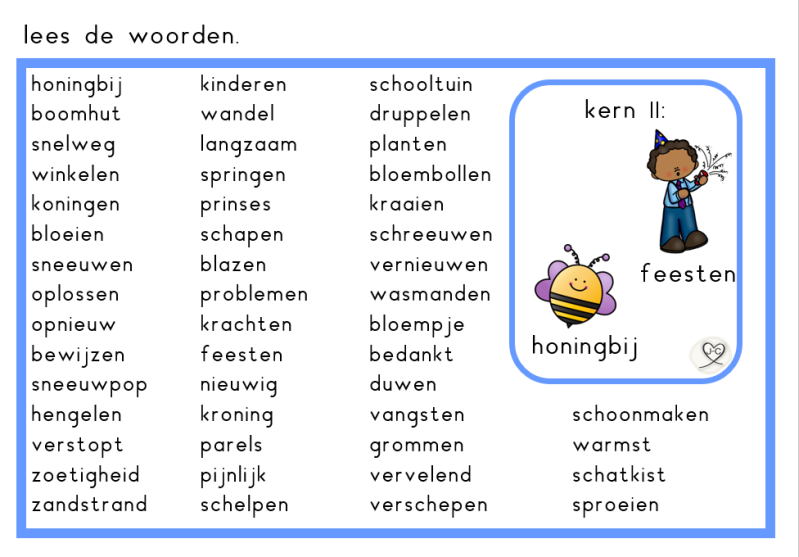 Laat de kinderen rollen met een dobbelsteen en een woordje kiezen uit de kolom. Dit woordje lezen zij en mogen zij daarna inkleuren. Wanneer ze een hele rij (of de hele kaart) vol hebben, hebben ze bingo. Ik deel dan vaak een sticker uit. De kinderen zijn zo spelenderwijs bezig met lezen.
