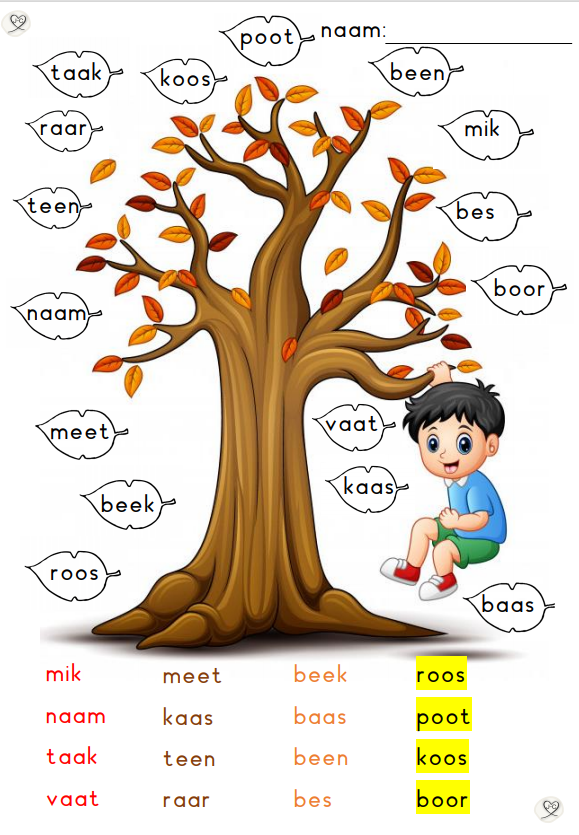 Vandaag hebben we de woorden goed gelezen (voor-koor-hoor). Daarna zijn we de woorden gaan zoeken in de bladeren en mochten we deze dezelfde kleur geven.