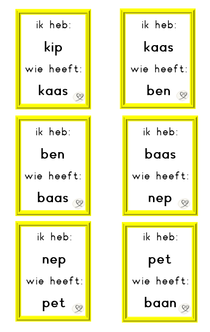 Een kind begint. Het zegt dan wat er op zijn kaartje staat. Ik heb .... wie heeft…?