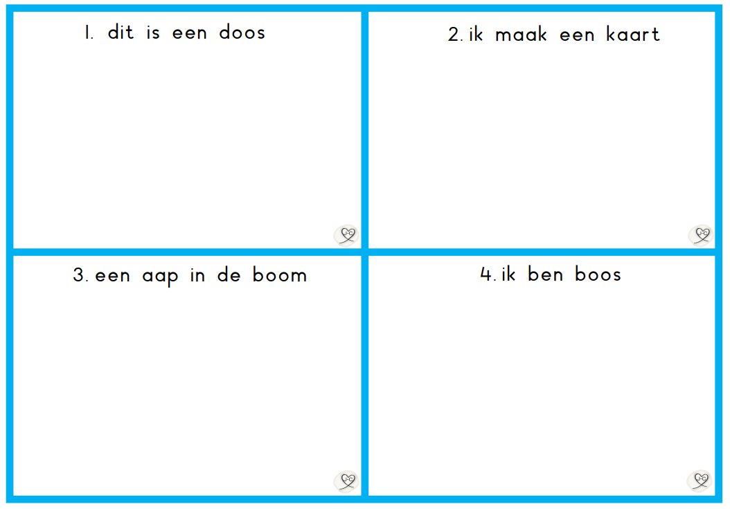 Een andere activiteit met deze plaatjes lijkt op het wandeldictee. Je hangt de plaatjes op door de klas. De kinderen lopen met het Leesdictee werkblad door de klas en kruisen de woorden af die ze gelezen hebben.