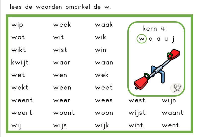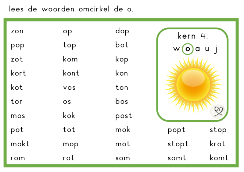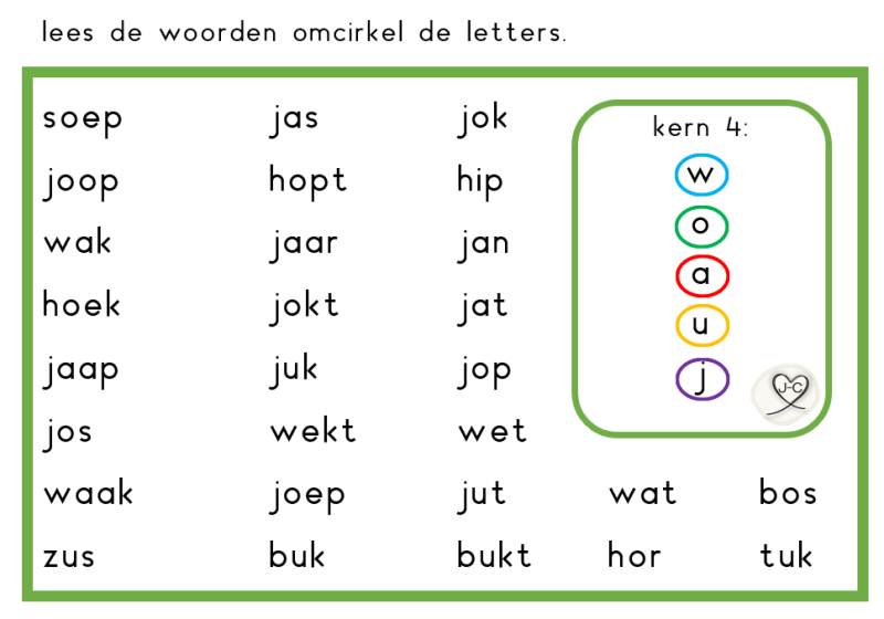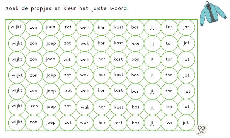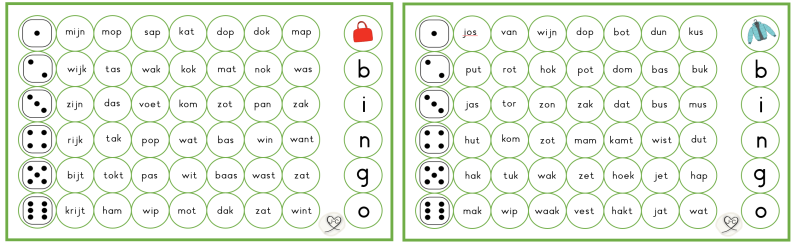 Laat de kinderen rollen met een dobbelsteen en een woordje kiezen uit de rij. Dit woordje lezen zij en mogen zij daarna inkleuren. Wanneer ze een hele rij (of de hele kaart) vol hebben, hebben ze bingo. Ik deel dan vaak een sticker uit. De kinderen zijn zo spelenderwijs bezig met lezen.