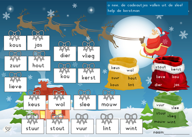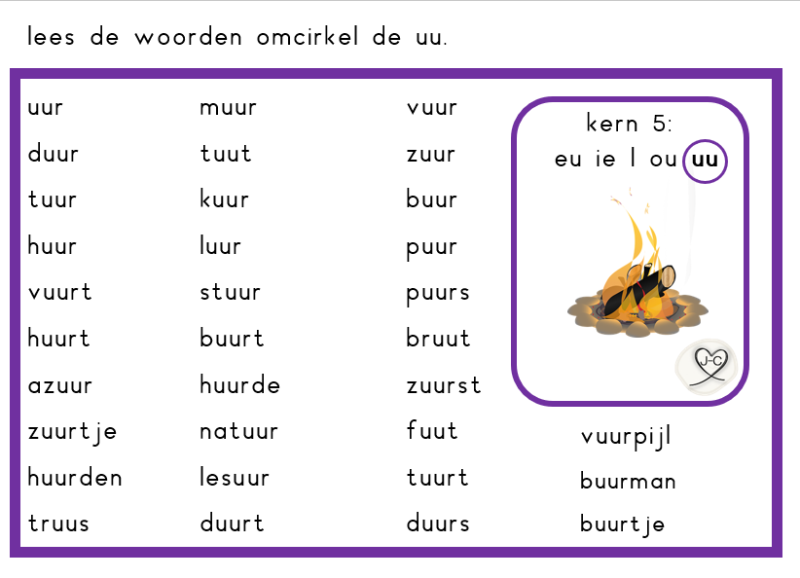 Laat de kinderen rollen met een dobbelsteen en een woordje kiezen uit de kolom. Dit woordje lezen zij en mogen zij daarna inkleuren. Wanneer ze een hele rij (of de hele kaart) vol hebben, hebben ze bingo. Ik deel dan vaak een sticker uit. De kinderen zijn zo spelenderwijs bezig met lezen.