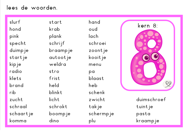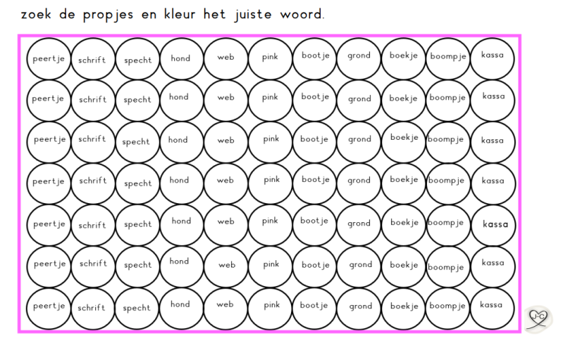 Laat de kinderen rollen met een dobbelsteen en een woordje kiezen uit de kolom. Dit woordje lezen zij en mogen zij daarna inkleuren. Wanneer ze een hele rij (of de hele kaart) vol hebben, hebben ze bingo. Ik deel dan vaak een sticker uit. De kinderen zijn zo spelenderwijs bezig met lezen.