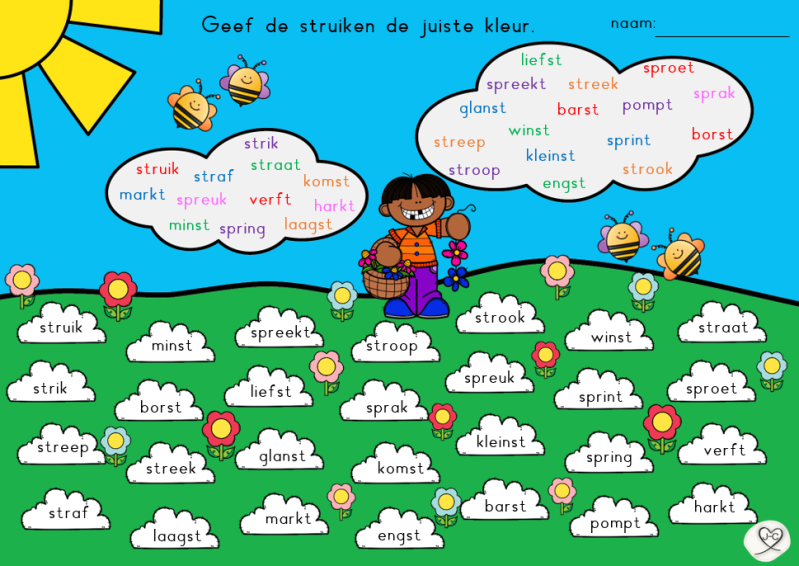 Laat de kinderen rollen met een dobbelsteen en een woordje kiezen uit de kolom. Dit woordje lezen zij en mogen zij daarna inkleuren. Wanneer ze een hele rij (of de hele kaart) vol hebben, hebben ze bingo. Ik deel dan vaak een sticker uit. De kinderen zijn zo spelenderwijs bezig met lezen.