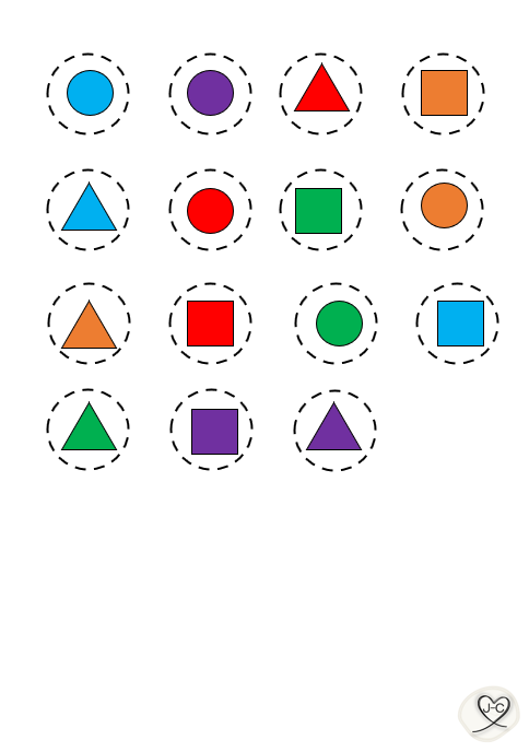 Knip de vormen uit en lamineer deze of laat de kinderen deze uitknippen.Laat de vormen sorteren op vorm of op kleur.